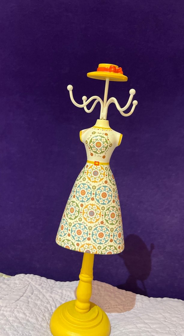 Detaylı desenlere sahip renkli elbise figürlü, üstünde küçük şapka bulunan dekoratif askılık.