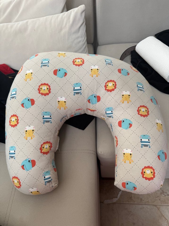Renkli hayvan desenlerine sahip emzirme ve hamile destek yastığı, rahat destek sağlar.