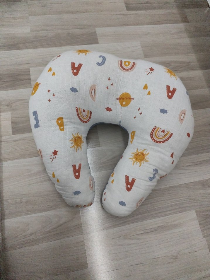 Hamilelik ve emzirme için çok renkli, hafif kumaşlı ve eğlenceli desenlere sahip yastık. temiz kullanılmıştır çift taraflı emzirme yastığı orta tarafta dikiş vardır