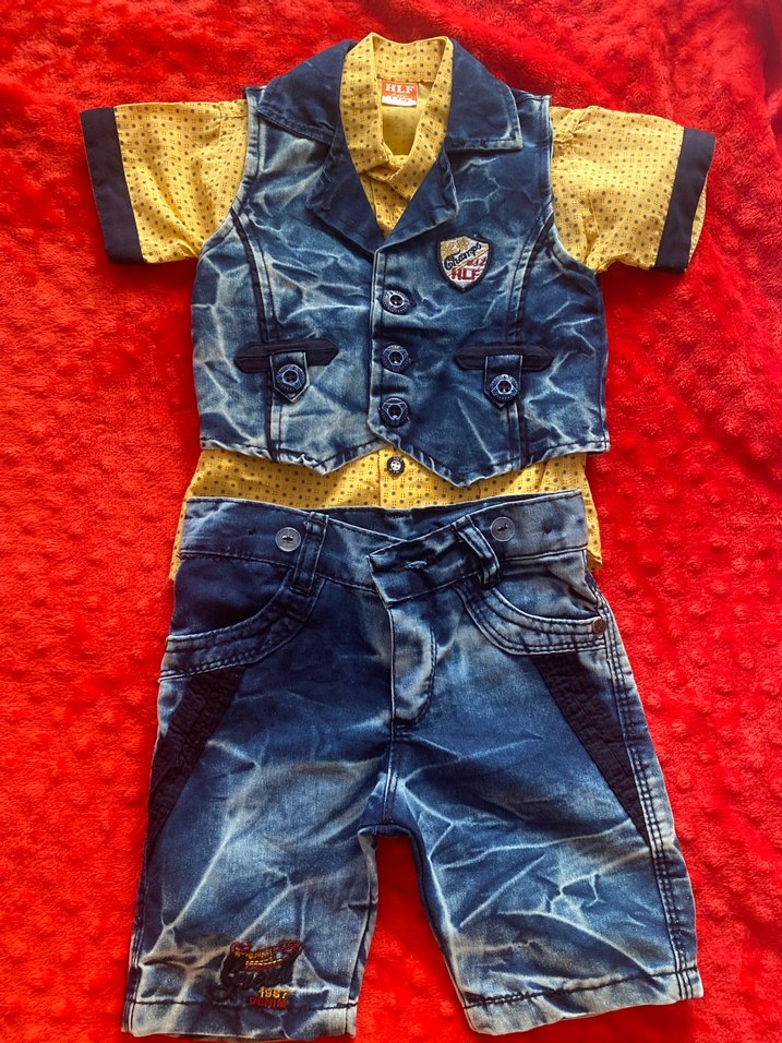 Hediye geldi hiç kullanmadım 1 yaş Renkli desenli gömlek, düğmeli yaka ve kolsuz kot yelek ile kot şorttan oluşan erkek bebek üçlü takımı. Sokak stiline uygun rahat tasarım.