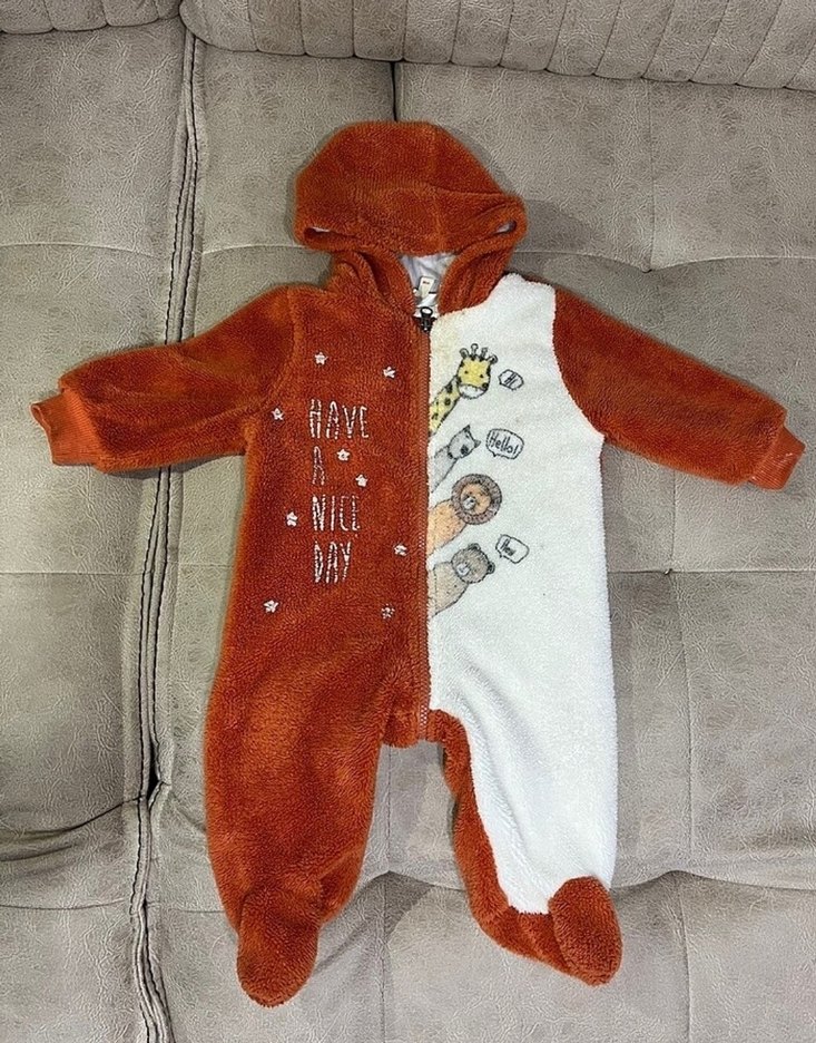 Bu erkek bebek tulumu, kapüşonlu ve yumuşak, sıcak kumaştan yapılmıştır. 2 yaşa kadar kullanabilirsiniz ebebek ten alınmıştır