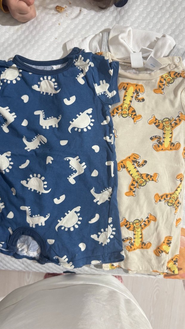 Kısa kollu, yakalı ve fırfırlı renkli erkek bebek tulumu. Dinozor ve kaplan desenleriyle sokak stili için yumuşak sentetik kumaştan yapılmıştır.