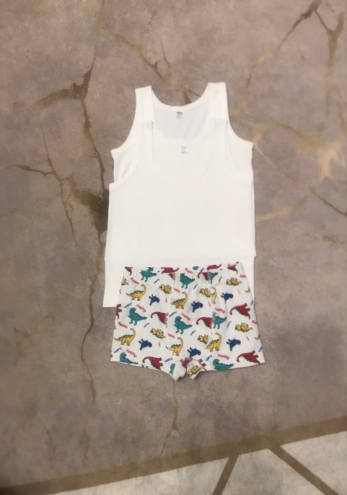 Beyaz askılı atlet ve renkli dinozor desenli çocuk boxer takımı. Rahat ve günlük kullanım için uygundur.