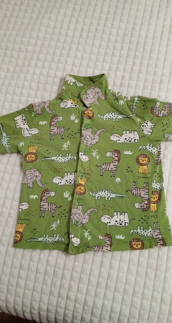 Renkli hayvan desenlerine sahip, kısa kollu, yakalı ve düğmeli erkek çocuk gömleği. Sentetik kumaştan, bol kesim ve bohem tarzda.