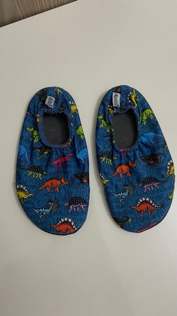 Mavi zemin üzerinde renkli dinozor desenlerine sahip, kaydırmaz tabanlı ve cırt cırtlı bağlama özelliği bulunan erkek çocuk terliği.