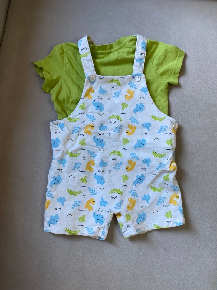 Pamuklu, bol kesim, renkli desenli erkek çocuk kısa tulum. Askılar tokalıdır ve yeşil kısa kollu tişörtle kombinlenmiştir. Sokak stili için uygundur.