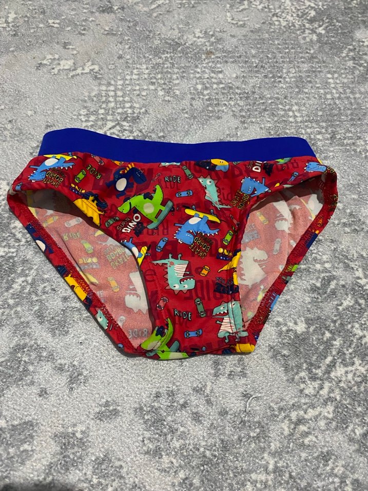 Renkli bağlama desenli, kırmızı tabanlı ve mavi bel bantlı erkek çocuk mayo.