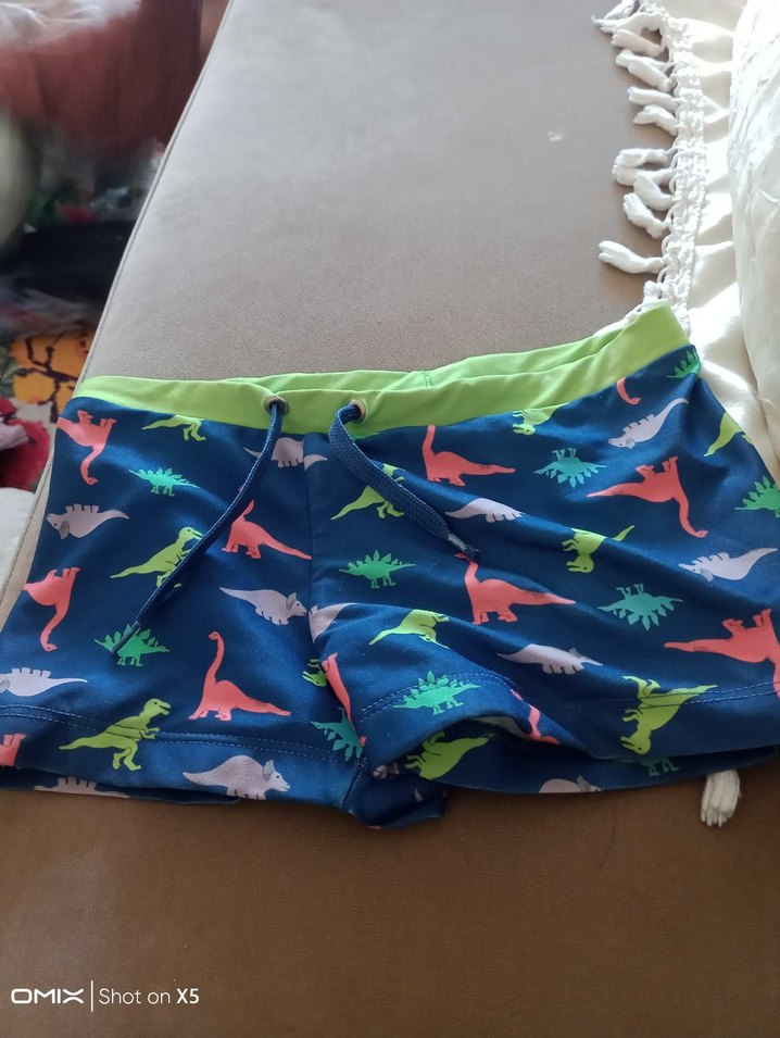 Dinozor desenli, yeşil bel bantlı, bağcık detaylı renkli erkek çocuk mayo şortu.