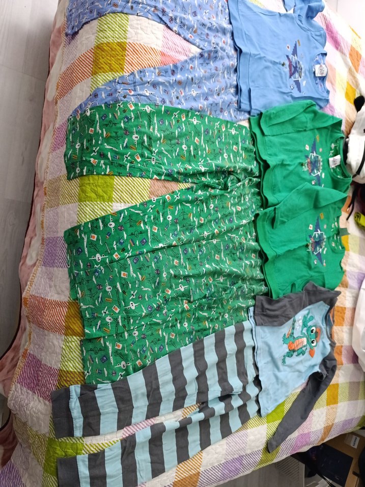 Bu erkek çocuk pijamaları renkli desenlere, uzun kollara ve oturan pileli tasarıma sahiptir. Yumuşak ve rahat boğazlı yakaları vardır. uzerinde ki etiket 5 6 yaş ama iri bir cocuksa 5 yaşta giyebilir