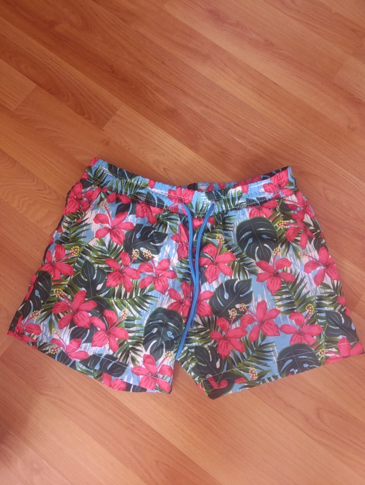 Renkli çiçek desenli, sentetik kumaştan erkek mini deniz şortu. Bol kesim ve kemerli, plaj ve sokak tarzına uygun.