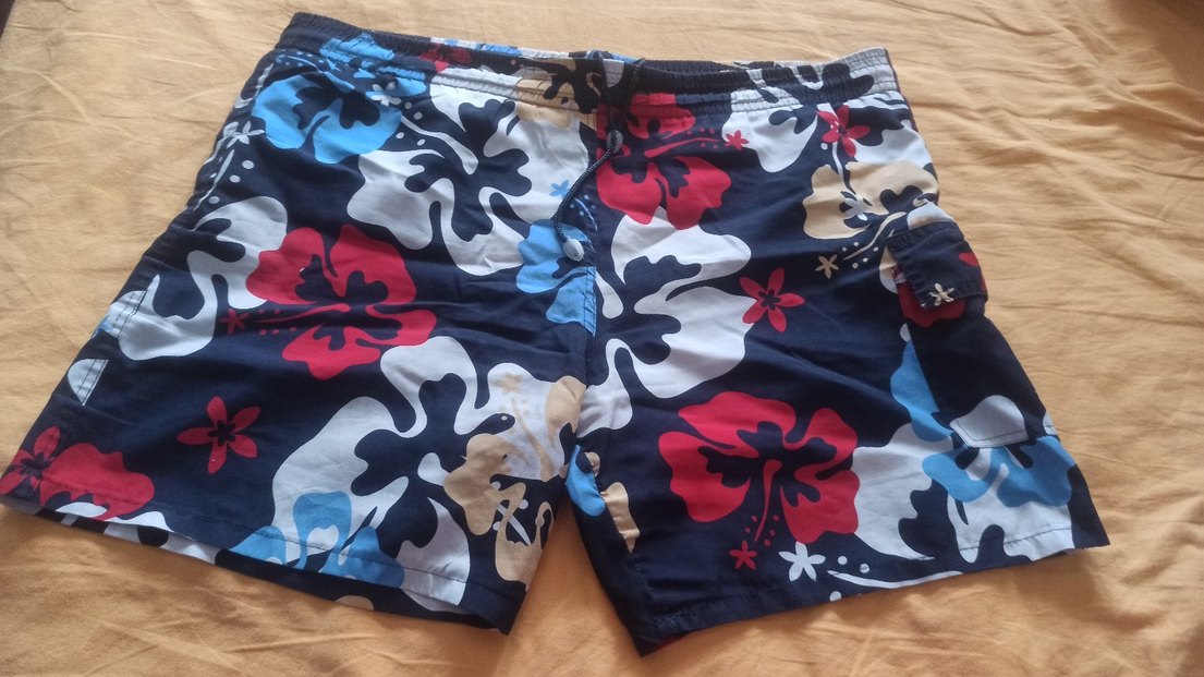 Renkli desenli, düğmeli ve bol kesim erkek mini şort mayo, bohem tarzı plaj için uygundur.