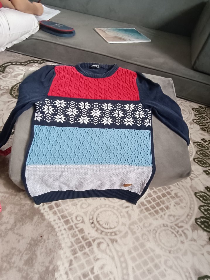 Bu erkek triko kazak, fitted kesim, bisiklet yaka ve uzun kolludur. Kırmızı, lacivert, açık mavi ve gri renklerde desenlidir, trend ve günlük sokak stili sunar.