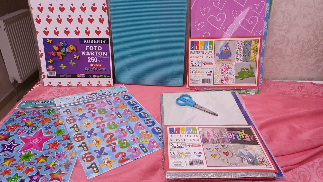 Okul etkinlikleri için renkli desenli ve simli EVA sayfaları, makas ve çıkartmalarla birlikte. Ölçü 20x30 cm. ✂️ hepsi bu fiyat