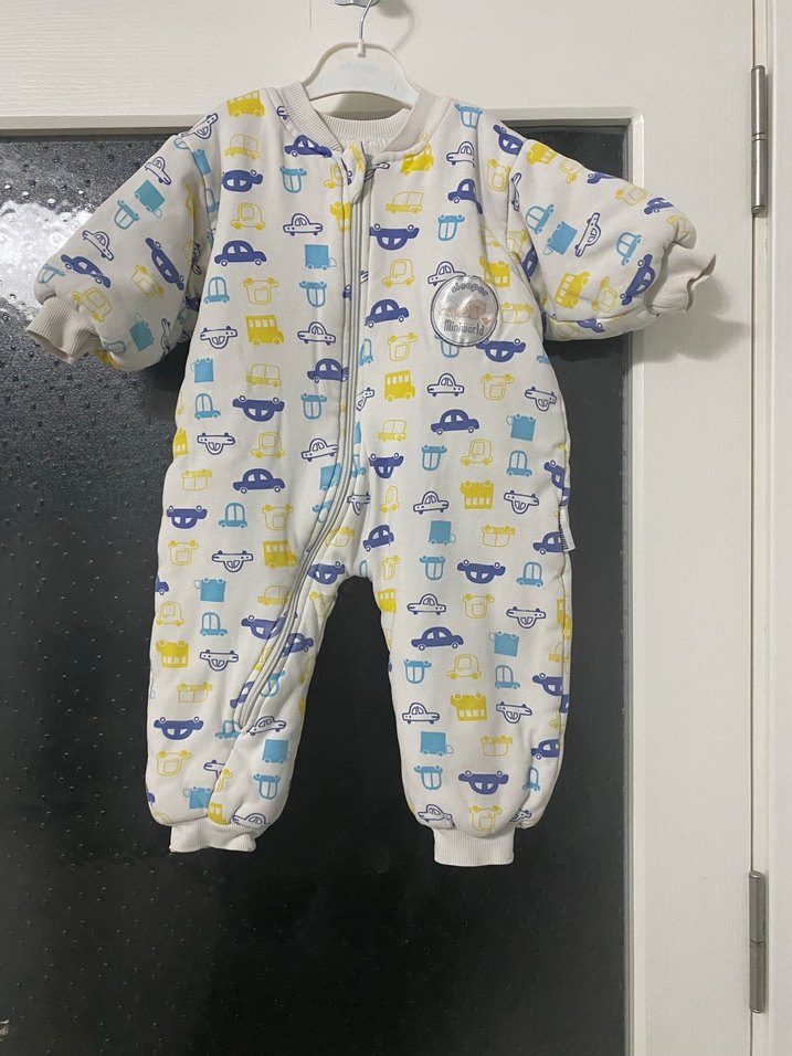 Uzun kollu, bisiklet yaka ve fermuarlı ön kısmı olan, yumuşak ve sıcak kumaştan yapılmış renkli desenli beyaz bebek tulumu. 2.5 tog