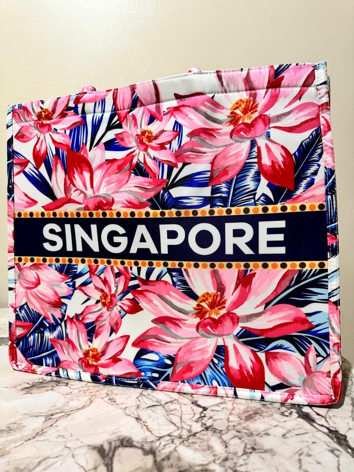 Sentetik kumaştan üretilmiş, renkli desenli ve fermuarlı kadın plaj çantası. Üzerinde 'SINGAPORE' yazısı bulunur, bohem ve retro tarzda günlük kullanıma uygundur.