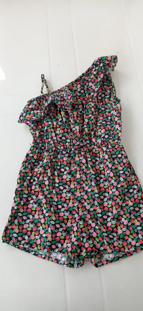 Renkli ve desenli, omuzda fırfırlı detaylı bebek kız tulumu. Canlı renklerle hareketli bir tasarıma sahiptir.