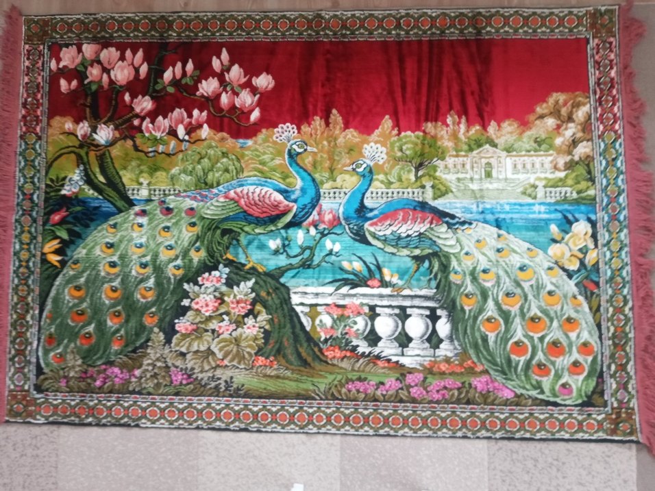 Bu geleneksel duvar halısı, canlı kırmızı zemin üzerinde tavus kuşları ve çiçek desenleriyle renkli bir baskıya sahiptir.130x180cm olculerindedir.
