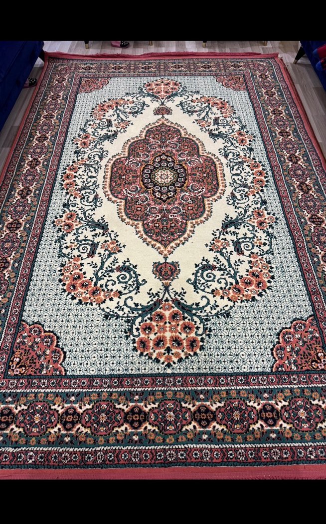 Bu renkli geleneksel halı, çiçek ve geometrik motiflerle karmaşık desenlere sahip, her odaya canlılık katıyor.