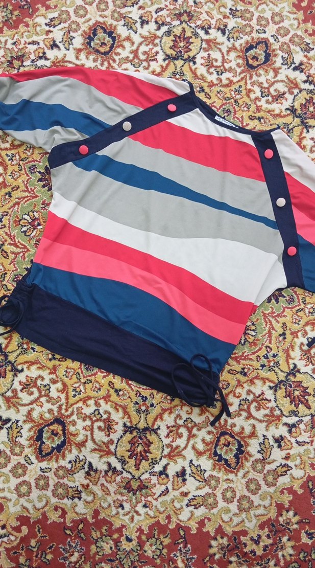 Renkli çizgili desene sahip, bol kesim hamile bluzu. Kısa kollu ve düğme detaylı, günlük kullanım için uygun.