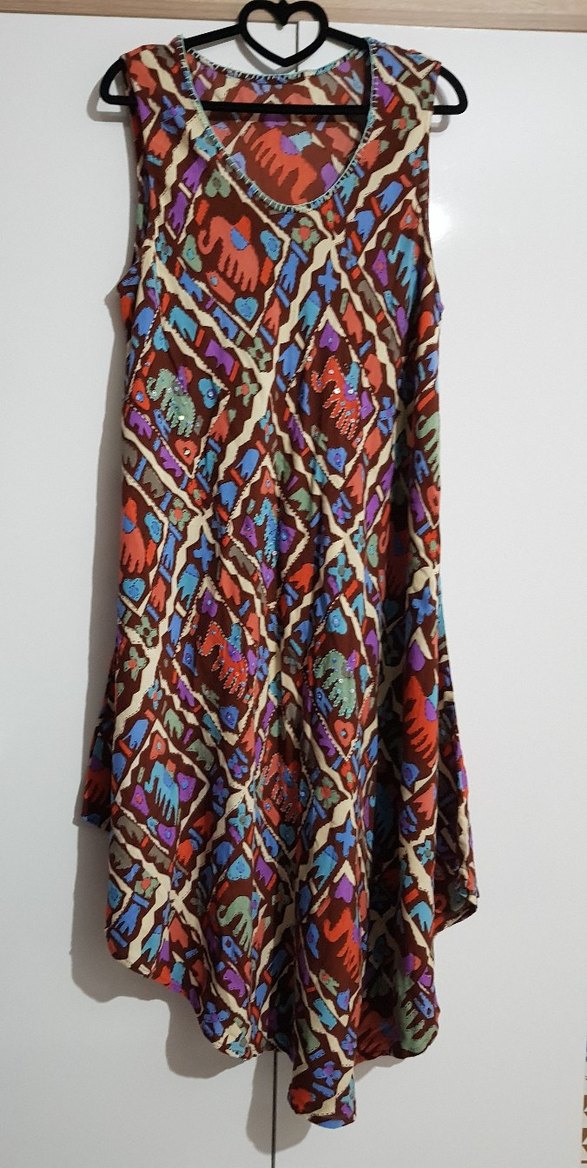 renkli otantik desenli hint işi kolsuz elbise. ince keten, tiril tiril. asimetrik kloş kesim. ön parçada bazı desenler elişiyle payetlenerek belirginleştirilmiş. 48/50 beden. göğüs tam çevre 114 cm. en kısa boy 94 cm, en uzun boy 120 cm. sadece 2 kere giyildi. (30derecede tersten yıkanır, kurutma yapılmaz.)