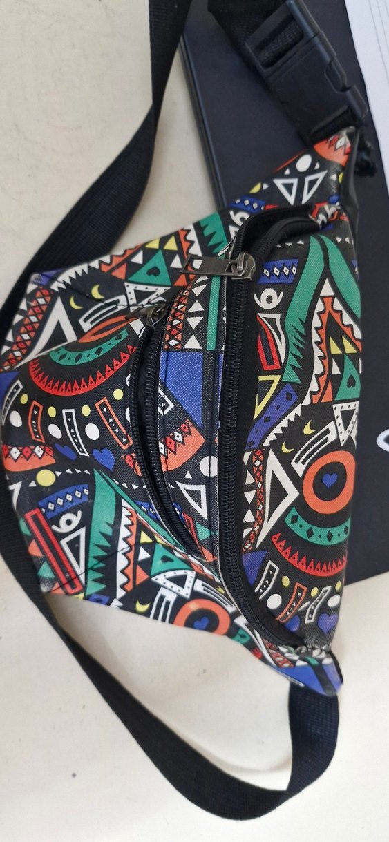 Renkli, desenli ve fermuarlı cepleri olan kadın bel çantası. Sentetik kumaştan, bohem ve retro tarzına uygun.