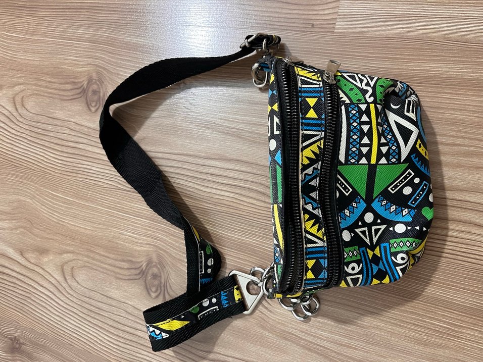 Renkli desenli sentetik kumaştan, fermuarlı bölmeli ve ayarlanabilir askılı kadın çapraz çanta. iç gözde küçük kalem lekesi mevcut ancak çıkabilir.