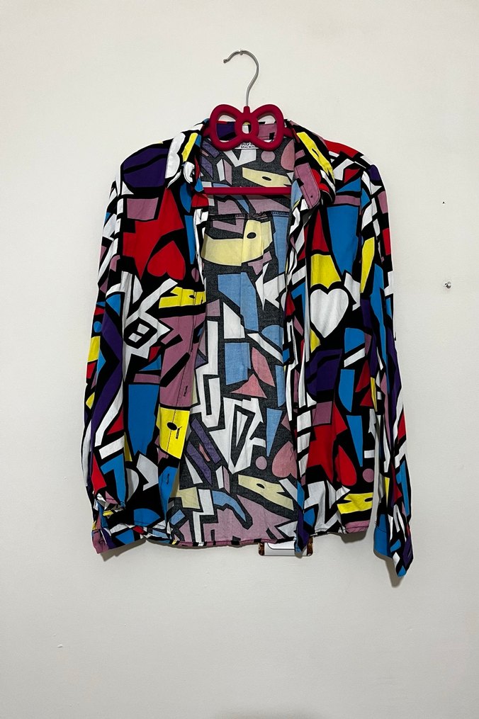 Renkli desenlere sahip, uzun kollu ve düğmeli kadın gömleği. Salaş kesimli, yakalı ve günlük kullanıma uygun sokak stili bir parça.