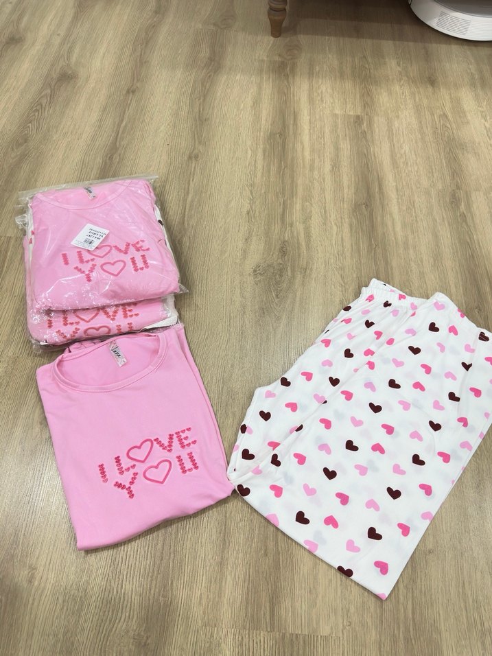 Renkli desenli, kısa kollu ve bol kesim kadın pijama takımı. Üstü pembe ve kalp desenli, altı kısa boylu ve kalp baskılıdır. Rahat ve şık sokak stili için uygundur.