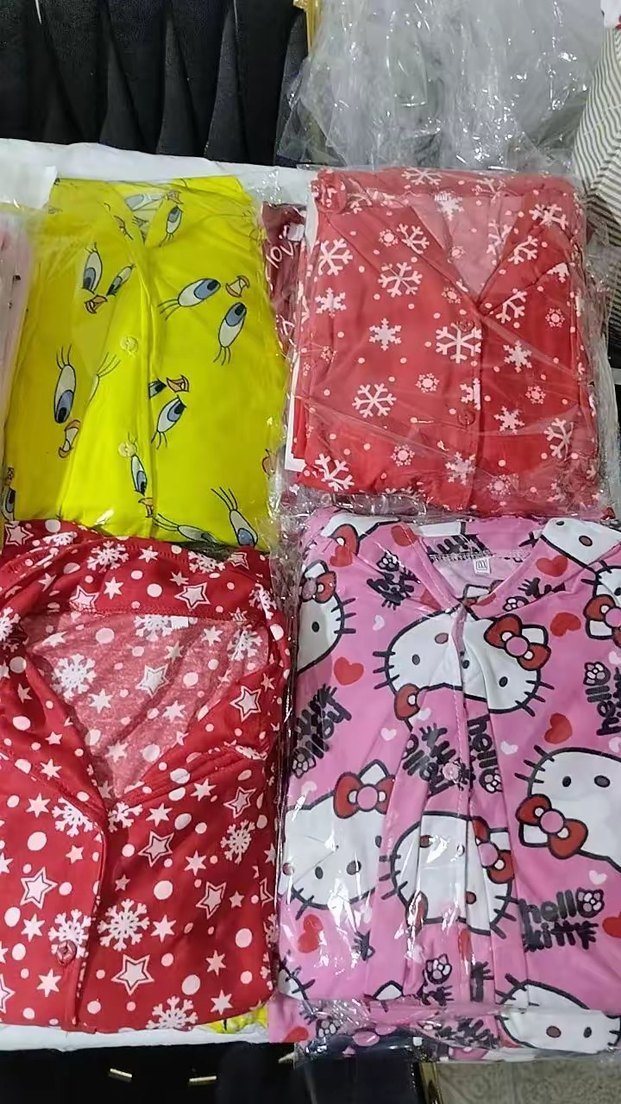 Pop kültür temalı, uzun kollu, renkli ve desenli kadın pijama takımları. Rahat ve vücuda oturan midi uzunluğunda modeller.