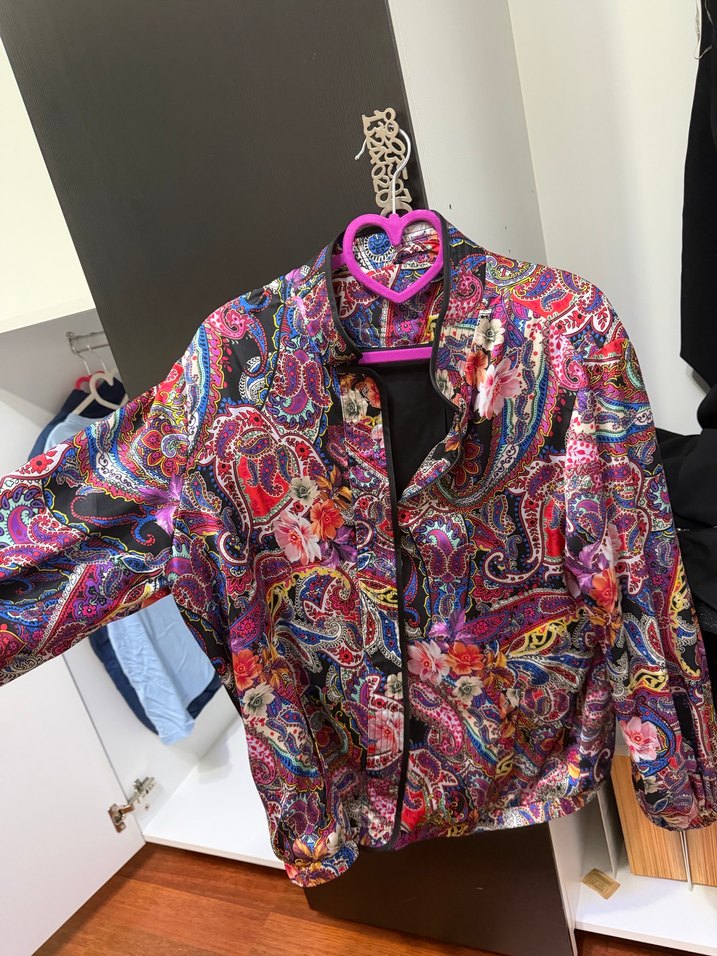 Renkli desenli, ipeksi dokulu, salaş kesim uzun kollu kadın gömleği. Notlu yaka ve düğmeli ön tasarıma sahip, günlük kullanım için uygundur. Ürün sayılı giyildi kusuru yok Boyu 64 cm Eni 61 cm Ürün m beden ama l ye de uyumlu