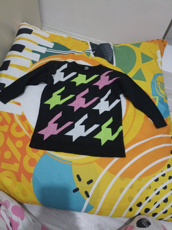 Kadınlar için uzun kollu, bisiklet yaka, örme sentetik kumaştan yapılmış renkli desenli triko kazak. Gevşek kesimi ve sokak modası etkisiyle günlük kullanıma uygundur.