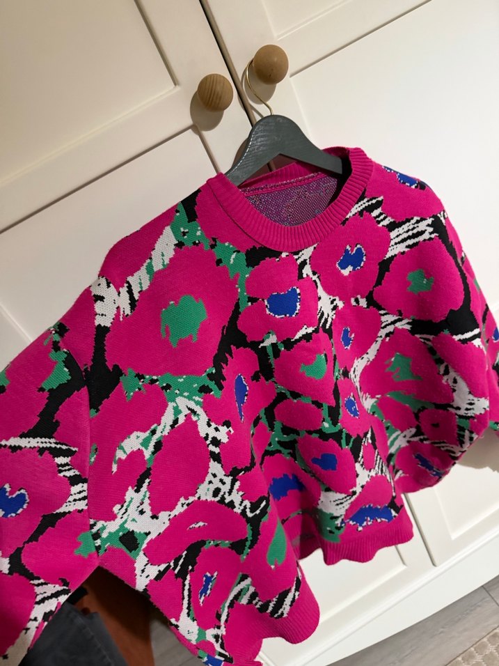 Renkli desenli, triko ve bol kesim kadın kazak. Bisiklet yaka, uzun kollu ve kısa boyda, sokak stiline uygun.