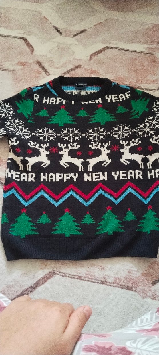 Renkli desenlere sahip, yuvarlak yakalı ve uzun kollu triko kazak. Gevşek kesimi ve yılbaşı temalı desenleriyle parti için uygundur.