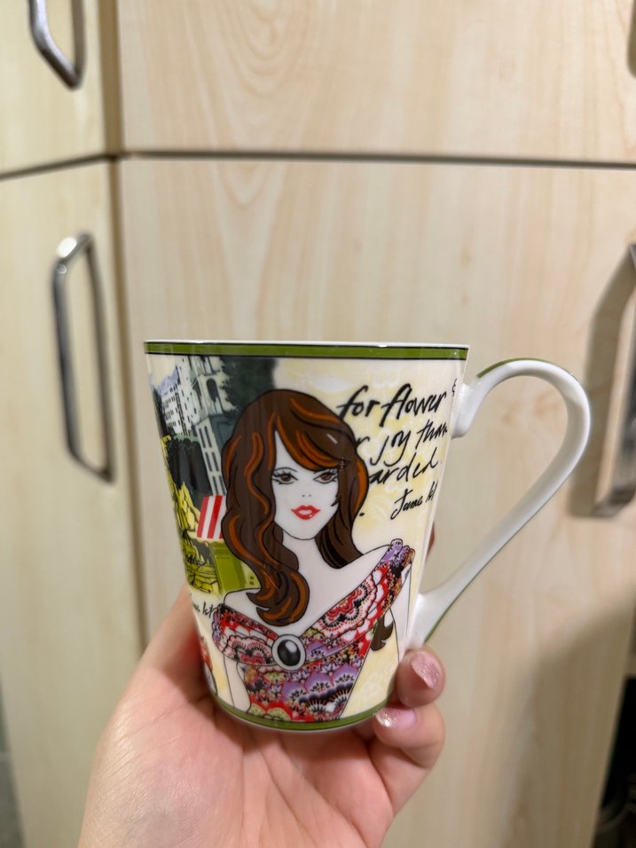 Renkli ve canlı desenlere sahip, kahverengi saçlı kadın figürlü kahve fincanı. Rahat tutuşlu sap ve parlak yüzey içerir. ☕