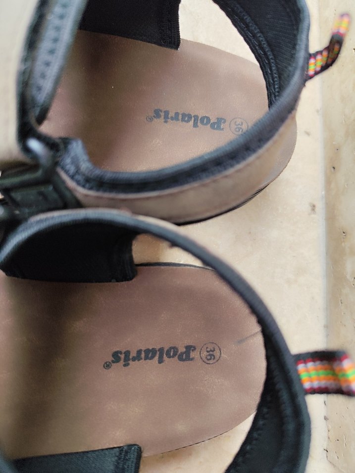 Kahverengi, renkli desenli ve tokalı kayışlara sahip erkek sandalet. Kauçuk malzemeden üretilmiş, sokak stili ve günlük kullanım için uygundur.