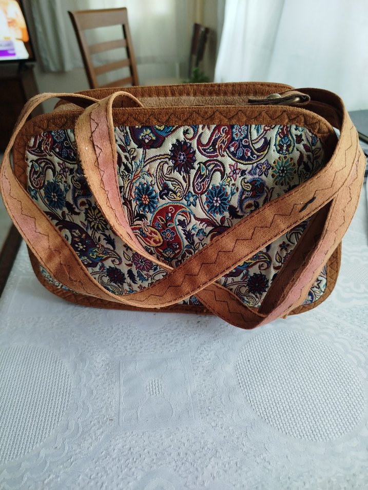Kahverengi süet malzemeden yapılmış, renkli desenlere ve tokalı askılara sahip bohem tarzda çanta.