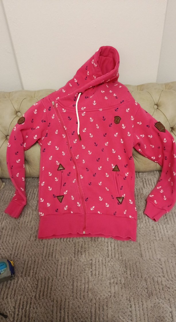 Yumuşak fleece kumaştan yapılmış, fermuarlı ve çapa desenli pembe kapüşonlu sweatshirt. Uzun kollu ve midi boyda, günlük sokak stili için uygun ölçüleri fotoğraflarda mevcuttur fermuar çalışır durumda sadece askı kısmı düşmüş .