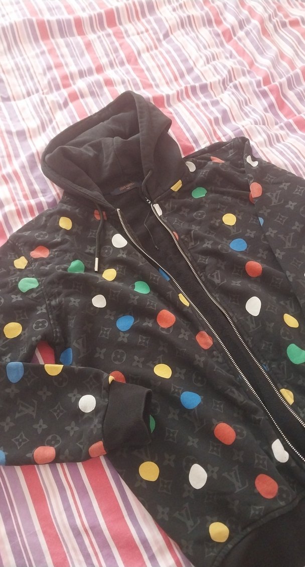 Kapüşonlu, fermuarlı ve bol kesim . Yumuşak ve sıcak kumaştan, koyu zemin üzerine renkli puantiye desenlidir.