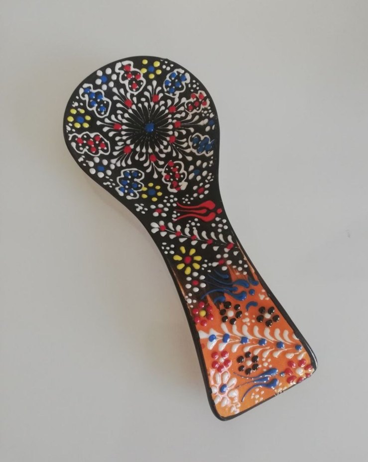 Canlı renklerde, koyu zemin üzerine işlenmiş çok renkli çiçek desenleriyle süslenmiş kaşık tutucu. ️Hiç kullanılmadı. #kaşıklık