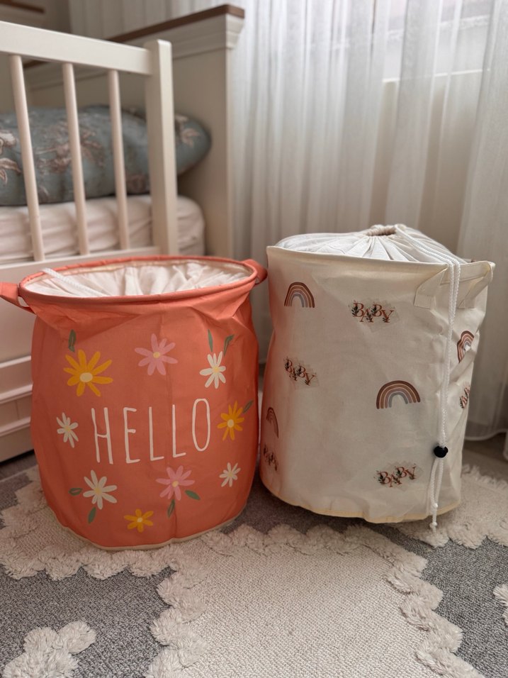 Çiçek ve gökkuşağı desenli, yumuşak kumaşlı, ipli kapamalı renkli saklama sepetleri. Birinde 'HELLO' yazısı bulunur.