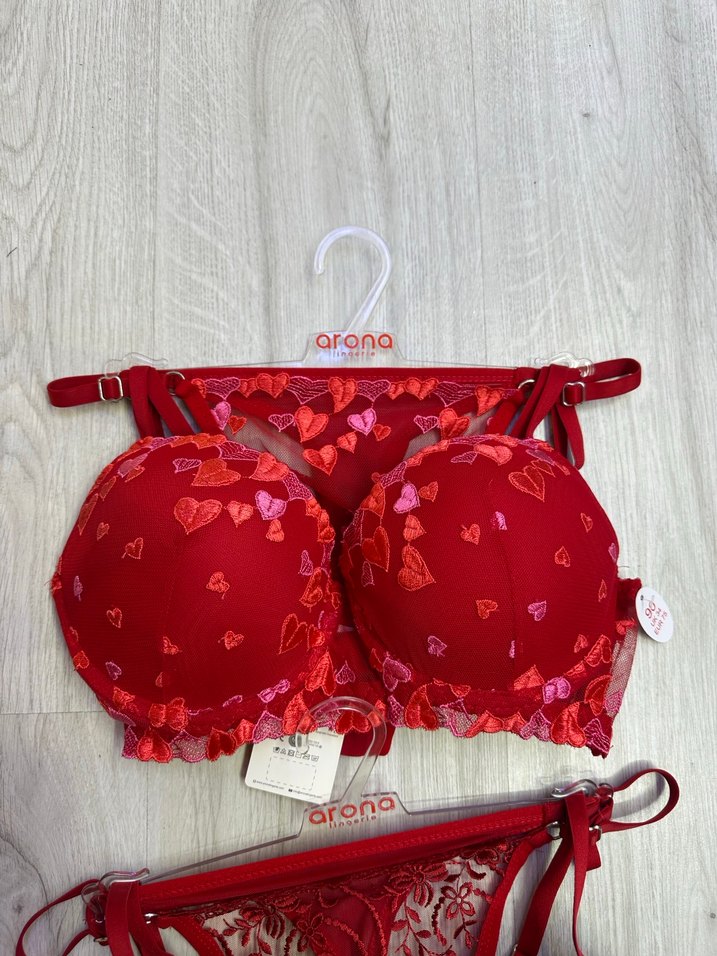 Renkli kalp desenleri ve ayarlanabilir askılarıyla bohem tarzda, kısa kesim rahat kırmızı sütyen. Marka: Arona. ❤️