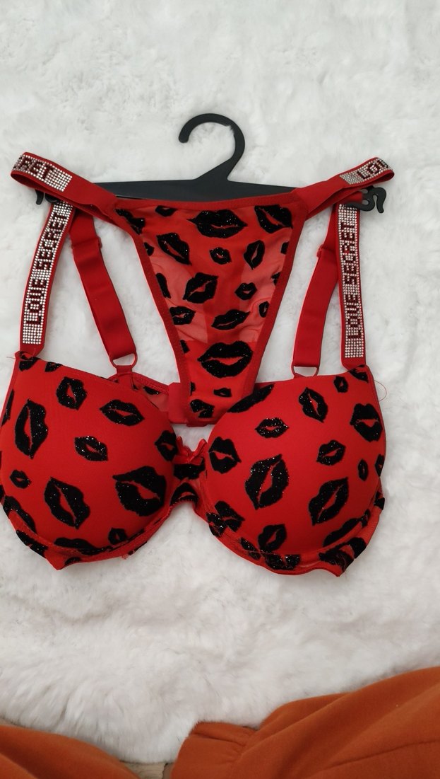 Canlı kırmızı renkte, dudak deseni baskılı kısa uzunlukta sütyen. Parlak yazılı askılarıyla gösterişli bir sokak giyimi tarzı sunar. 80.85. bedenler mevcuttur