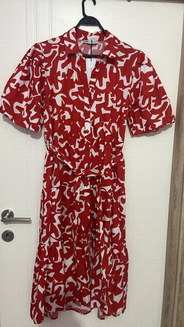 Renkli desenli, kırmızı uzun ve bol kesim hemşire önlüğü. Kısa kollu ve V yakalı tasarıma sahiptir.