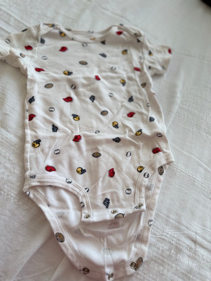 Kısa kollu, yuvarlak yakalı ve düğmeli renkli desenli bebek kızı bodysi.
