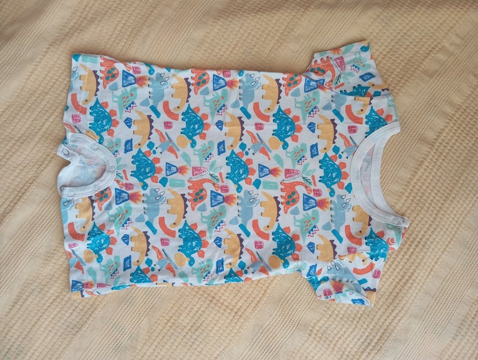 Bu renkli bebek tulumu, kısa kollu, yuvarlak yakalı ve düğmeli. Yumuşak kumaştan, eğlenceli pop kültür desenleri içerir.