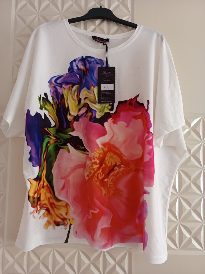 Kadın bluz, ipeksi kumaş üzerine renkli baskılı tasarıma sahip, kısa kollu ve yuvarlak yakalıdır. Salaş kesim ve kısa boydadır, günlük kullanım için uygundur.