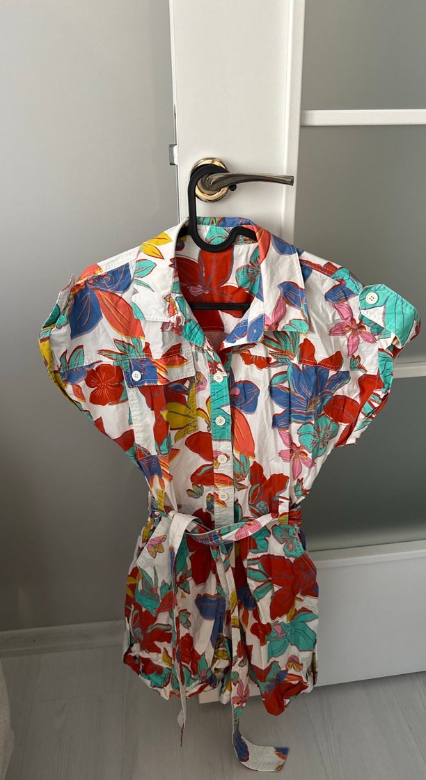 Renkli desenli, kısa kollu, yakalı ve tulum. Bol kesimiyle bohem tarzını yansıtan günlük kullanıma uygun bir model. Birkaç kez kullanıldı temiz sıkıntısız