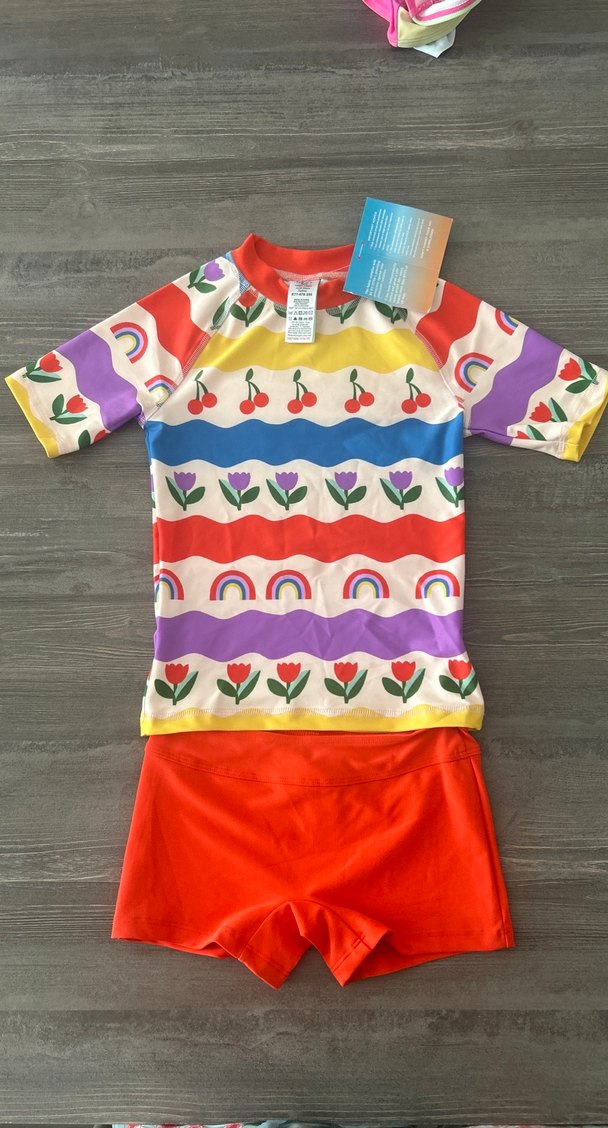 Renkli desenlere sahip kısa kollu üst ve kırmızı düz şortlu kiz mayo takımı.