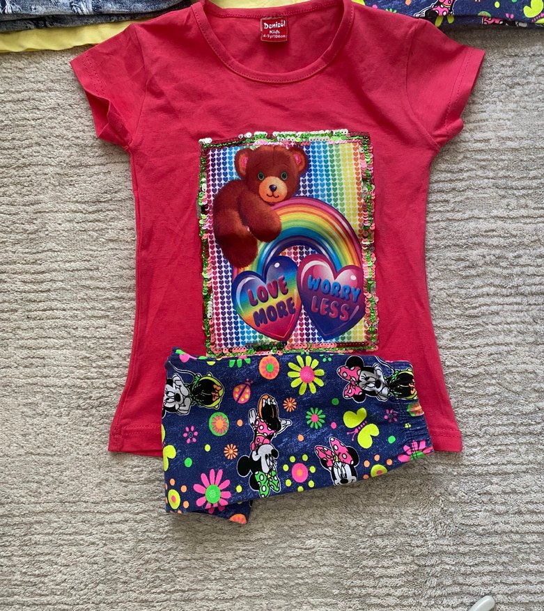Kısa kollu, renkli baskılı ayıcık ve gökkuşağı detaylı üst ile çiçek ve karakter desenli tayttan oluşan bebek kız takımı.
