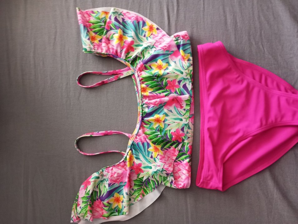 Renkli desenli, askılı bikini üstü ve canlı pembe altı ile kızlar için plajda kullanıma uygun.